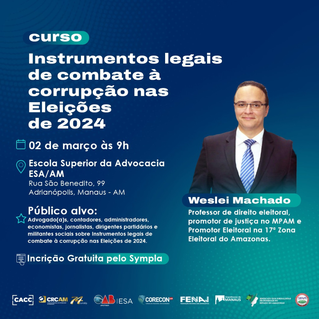 O curso será ministrado pelo professor de direito eleitoral, promotor de justiça no Ministério Público do Amazonas (MP-AM) e promotor eleitoral na 17ª Zona Eleitoral do Amazonas, Weslei Machado.