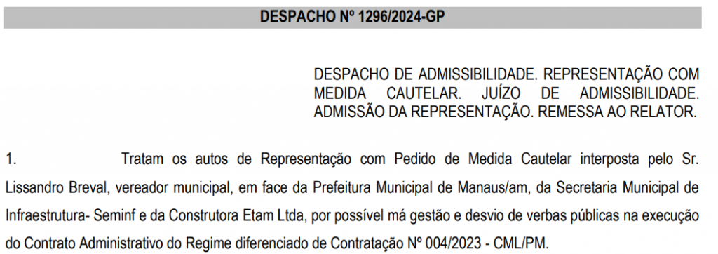 Segundo consta no documento apresentado pelo vereador Lissandro Breval (Progressistas) ao TCE-AM, os projetos executivos de Arquitetura e Engenharia não foram disponibilizados nem divulgados pela Seminf ou pela Prefeitura de Manaus “em violação aos princípios da publicidade e transparência“.
