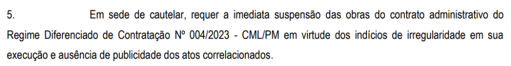 Ainda de acordo com a representação, a conduta impede a cópia de documentos importantes para fiscalização da aplicação da verba pública. O vereador solicita, em forma de medida cautelar, a imediata suspensão das obras em “virtude dos indícios de irregularidade em sua execução e ausência de publicidade dos atos correlacionados“.