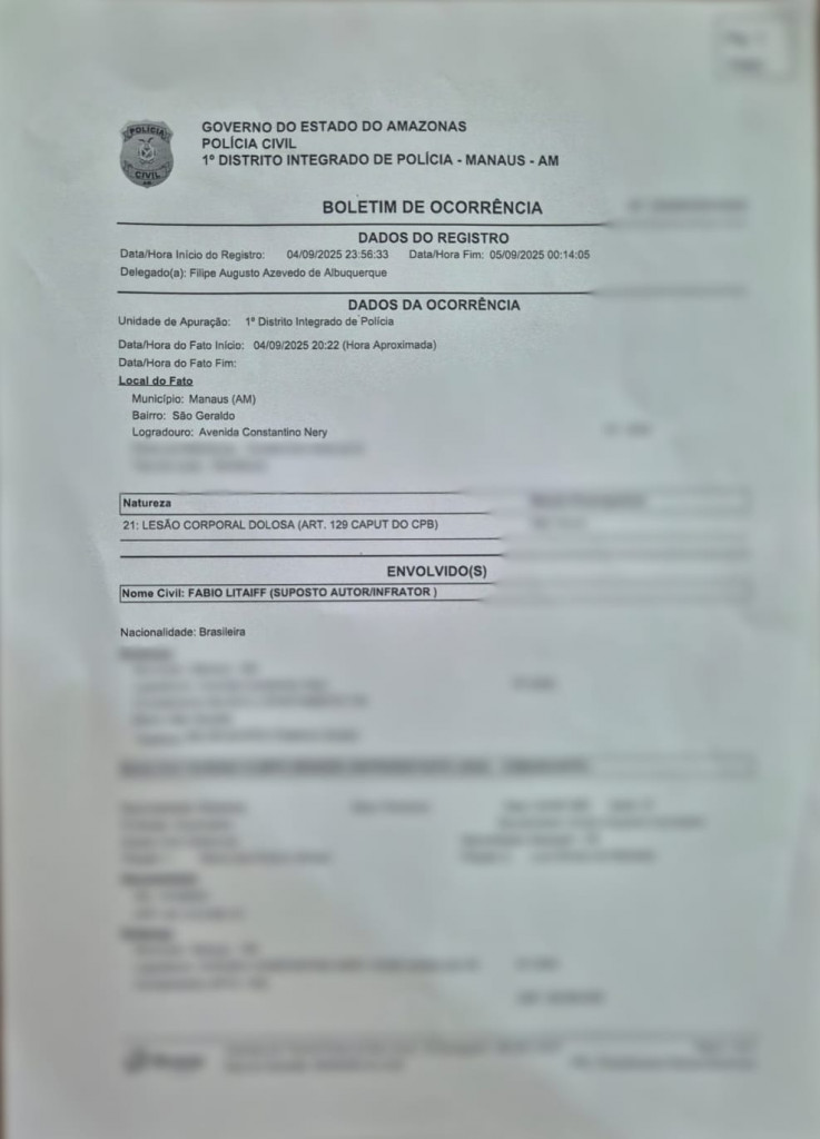 MANAUS (AM) – O oficial de justiça do Tribunal de Justiça do Amazonas (TJAM) Fábio Litaiff, de 49 anos, é acusado de dar um tapa em uma criança de 8 anos dentro de um condomínio na Avenida Constantino Nery, na Zona Centro-Sul de Manaus, no último dia 4. A agressão causou a perfuração do tímpano do menino, segundo laudo médico. O caso foi registrado pela mãe da vítima como lesão corporal dolosa no 1º Distrito Integrado de Polícia (DIP).