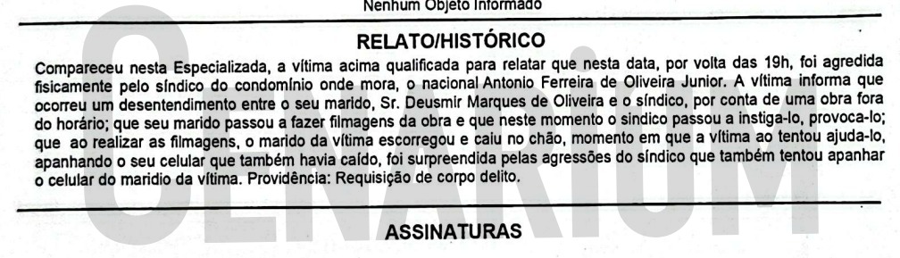 De acordo com o boletim de ocorrência registrado na Delegacia Especializada em Crimes contra Mulher (DECCM), o qual a reportagem teve acesso, também cita houve um desentendimento entre o síndico e o marido da vítima “por uma obra fora do horário permitido no condomínio”. O marido da vítima passou a filmar a situação, momento em que o síndico começou a provocá-lo.