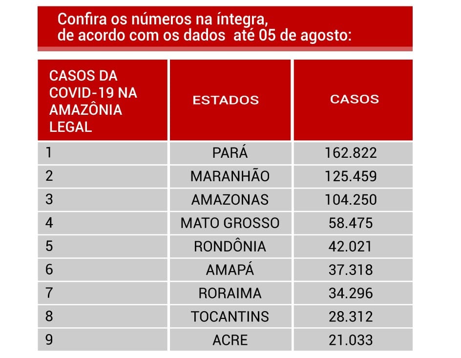 Em relação ao número de casos, até quarta-feira, 5, também foram confirmados 613.986 casos da Covid-19, sendo que os nove Estados da Amazônia Legal registravam 21,4% do total no Brasil (2.862.761). Na liderança entre os Estados com mais casos, óbitos e recuperados, Pará está em primeiro, com 162.882 infectados, 5.835 mortes e 147.576 curados.