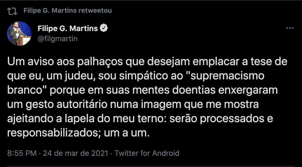 Filipe Martins afirma que estaria apenas ajustando seu terno, e que o gesto não foi feito com nenhuma intenção política. Ele disse ainda que pretende processar qualquer pessoa que insinue que ele fez apologia ao supremacismo branco.