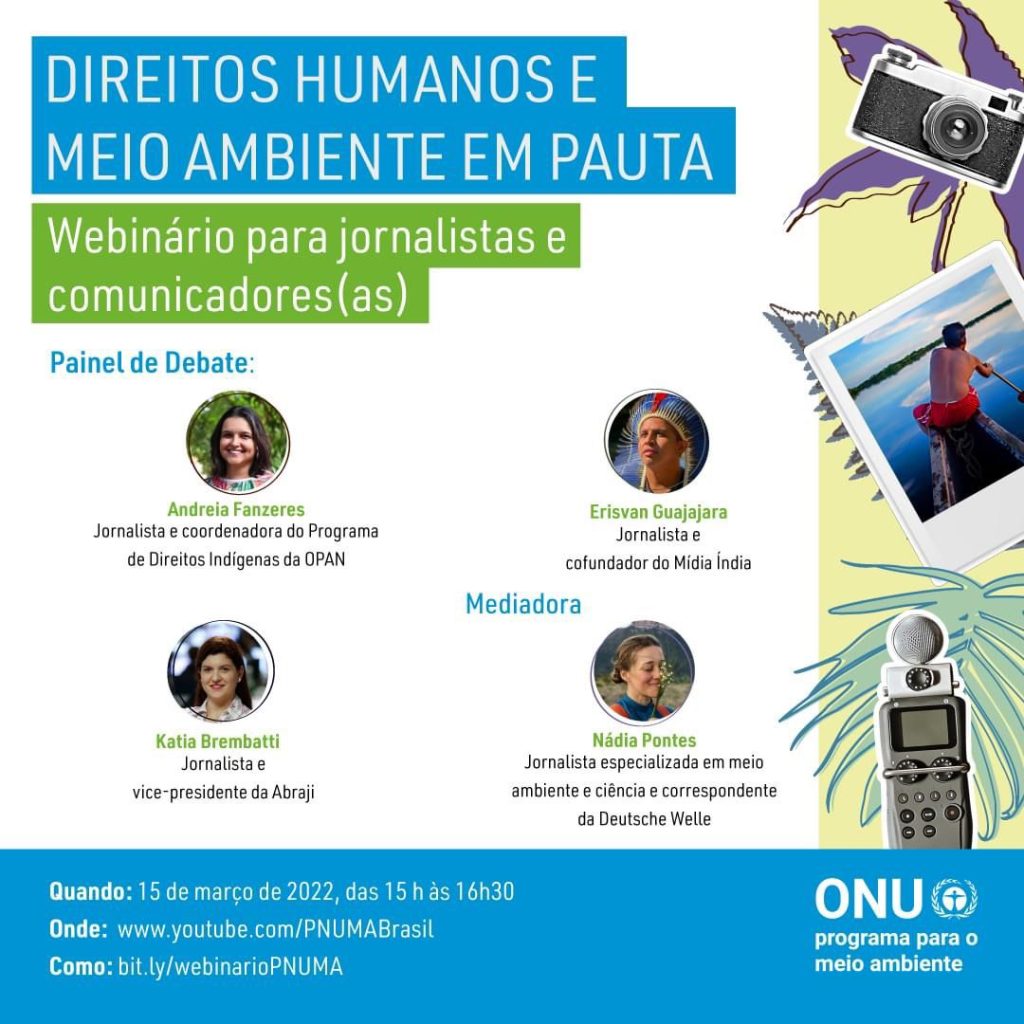 O debate terá a participação da jornalista e vice-presidente da Associação Brasileira de Jornalismo Investigativo (Abraji), Katia Brembatti; do jornalista e cofundador do Mídia Índia, Erisvan Guajajara; e da jornalista e coordenadora do Programa de Direitos Indígenas da Operação Amazônia Nativa, Andreia Fanzeres.