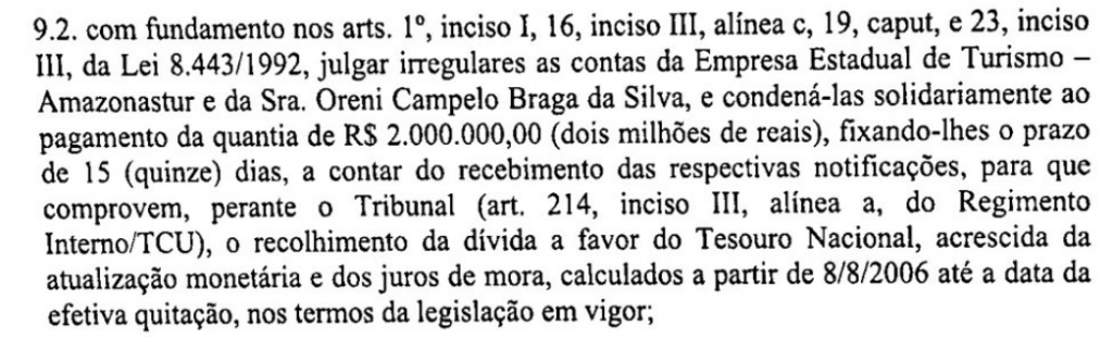MANAUS (AM) – O Tribunal de Contas da União (TCU) confirmou, em maio deste ano, no Acórdão 3106/2024, a condenação da ex-presidente da Empresa Estadual de Turismo do Amazonas (Amazonastur) Oreni Braga por irregularidades na execução do Convênio 255/2006, celebrado entre o Ministério do Turismo (MTur) e o órgão estatal. Atualmente na presidência da Fundação de Apoio ao Idoso Doutor Thomas (FDT), ela terá que devolver, à União, a quantia de R$ 2 milhões.
