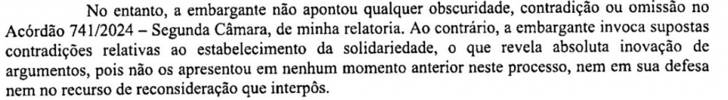 O relator Antonio Anastasia declarou que não havia contradição na decisão do TCU. O magistrado apontou que a embargante não apresentou “qualquer obscuridade, contradição ou omissão“ nas decisões anteriores. “Ao contrário, a embargante invoca supostas contradições relativas ao estabelecimento da solidariedade, o que revela absoluta inovação de argumentos, pois não apresentou em nenhum momento anterior nesta processo, nem em sua defesa nem no recurso de reconsideração que interpôs“, declarou.