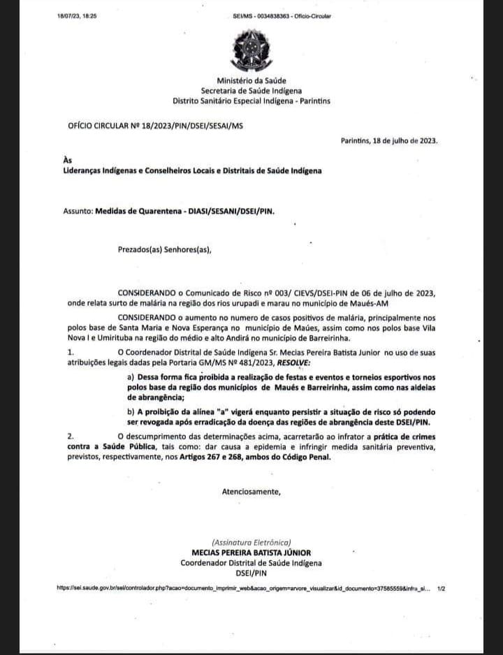 “Fica proibida a realização de festas, eventos e torneios esportivos nos polos base da região dos municípios de Maués e Barreirinha, assim como nas aldeias de abrangência”, diz um trecho do ofício assinado pelo coordenador do Dsei, Mecias Pereira Batista Júnior.