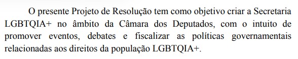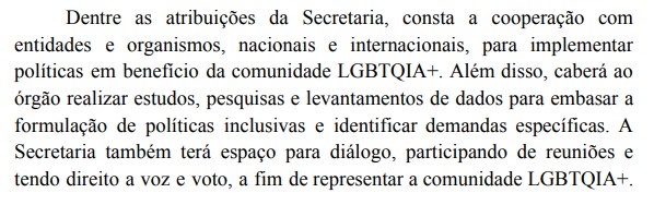 O texto da propositura prevê que a pasta tenha atuação direcionada à promoção de eventos, à realização de debates sobre questões relacionadas aos interesses dessa população, a nível nacional, além da fiscalização, acompanhamento, avaliação e controle das políticas governamentais relativas aos direitos de pessoas LGBTQIAPN+.