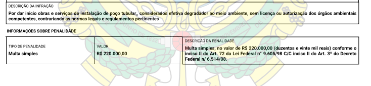 “Por dar início obras e serviços de instalação de poço tubular, considerados efetiva degradador ao meio ambiente, sem licença ou autorização dos órgãos ambientais competentes, contrariando as normas legais e regulamentos pertinentes“, afirmou o órgão fiscalizador no Auto de Infração AIN-24.05.23-151615Q-Ipaam sobre o flagrante.