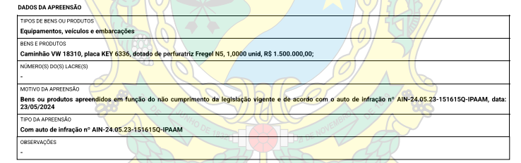 De acordo com o Termo de Embargo e Interdição TEI-24.05.23-152939B-Ipam, o caminhão e os equipamentos apreendidos ficarão sob guarda da Polícia Militar do Amazonas (PM-AM).