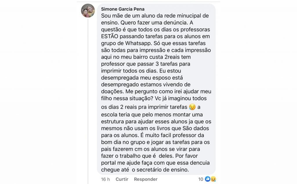 Ela afirma que as tarefas são repassadas em um grupo de pais e professores no aplicativo de mensagem WhatsApp e que os estudantes não usam livros. A mãe do aluno ressalta, ainda, que cabe aos pais realizarem o trabalho dos professores na hora de ensinar as matérias e as atividades.