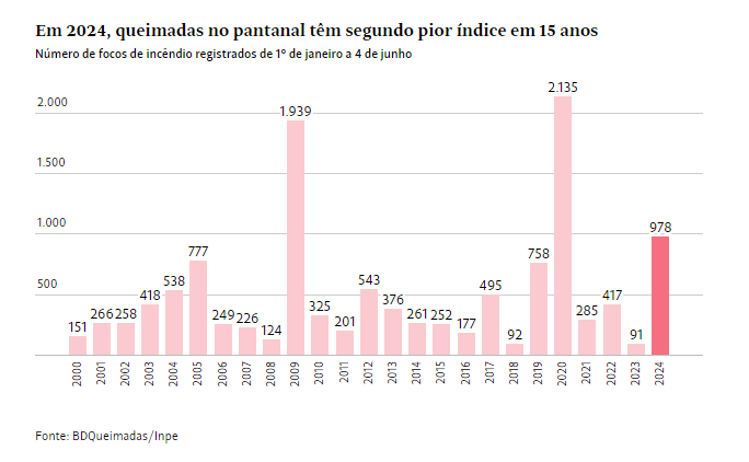 SÃO PAULO – Depois de uma atípica temporada intensa de fogo em novembro passado, o Pantanal volta a ficar sob alerta. De janeiro ao início de junho de 2024, os focos de incêndio no bioma aumentaram 974% na comparação com o mesmo período do ano anterior.