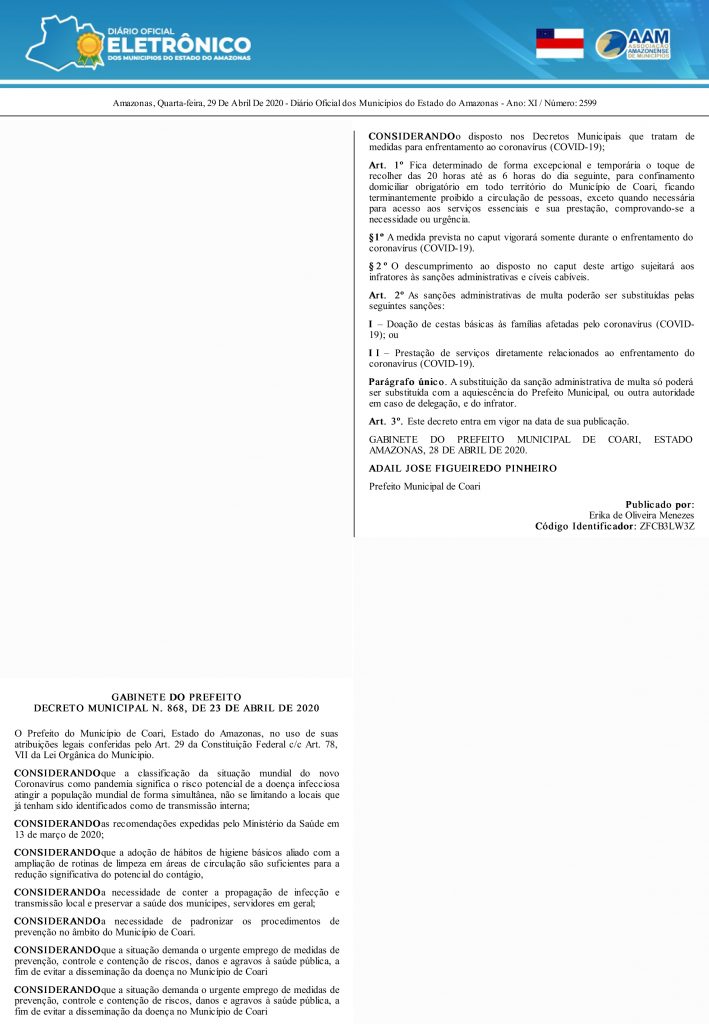 Por meio das redes sociais, o prefeito Adail Filho disse que desde os primeiros casos de Covid-19 no Amazonas, Coari tem estabelecido medidas preventivas e que decretou situação de urgência na saúde do município.