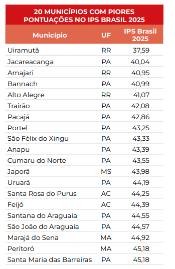A realidade não é diferente para os municípios com população entre 5 mil e 20 mil habitantes. Trairão (PA) e Cumaru do Norte (PA) estão entre os piores desempenhos do País, com pontuações de 42,08 e 43,55, respectivamente. São João do Araguaia (PA) e Santa Maria das Barreiras (PA) também se destacam negativamente, consolidando a presença do Estado entre as localidades com menor progresso social.