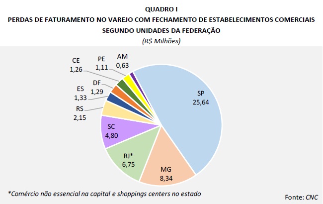 Conforme estudo da CNC, todo o varejo do estado teve uma queda no faturamento de R$ 630 milhões até o dia 7 de abril deste ano, apesar disso, o montante foi o menor entre as dez unidades federativas pesquisadas. No cenário nacional, o varejo perdeu o equivalente a R$ 53,3 bilhões no faturamento.