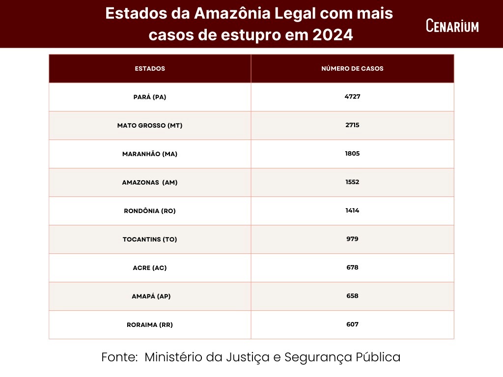 MANAUS (AM) – Dados do Ministério da Justiça e Segurança Pública (MJSP) mostram que o Pará liderou o ranking dos Estados da Amazônia Legal com o maior número de casos de estupro em 2024, registrando 4.727 ocorrências. Mato Grosso aparece em segundo lugar, com 2.715 casos, seguido pelo Maranhão, com 1.805. Amazonas e Rondônia também apresentam números alarmantes, com 1.552 e 1.414 casos respectivamente. Enquanto Tocantins (979), Acre (678), Amapá (658) e Roraima (607) registram índices menores, mas igualmente preocupantes.