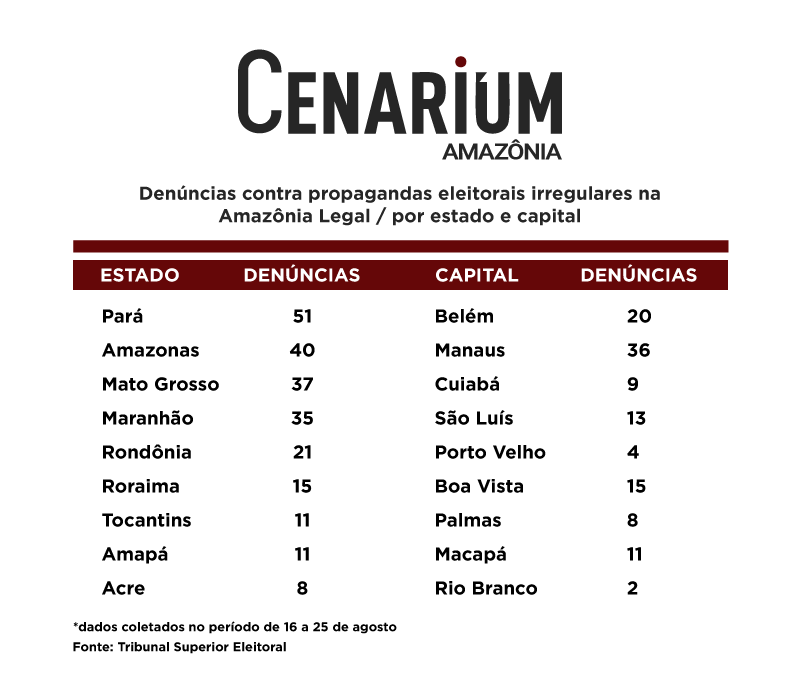 Em seguida, o Amazonas aparece com 40 registros oficiais de irregularidades em propagandas eleitorais, sendo também a maior parte delas na capital Manaus, no total de 36, duas em Itacoatiara e uma em Anamã e Novo Airão, cada.