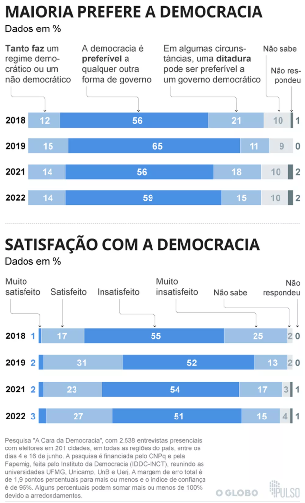 Apesar de estridente, o movimento político que apoia o presidente e que por vezes cobra o fechamento do Supremo Tribunal Federal é minoria quando a opção entre democracia ou um sistema autoritário de governo está em jogo: 59% dos brasileiros disseram aos pesquisadores preferirem a democracia a qualquer outra forma de governo, enquanto 15% afirmam que, “em algumas circunstâncias, uma ditadura pode ser preferível”.