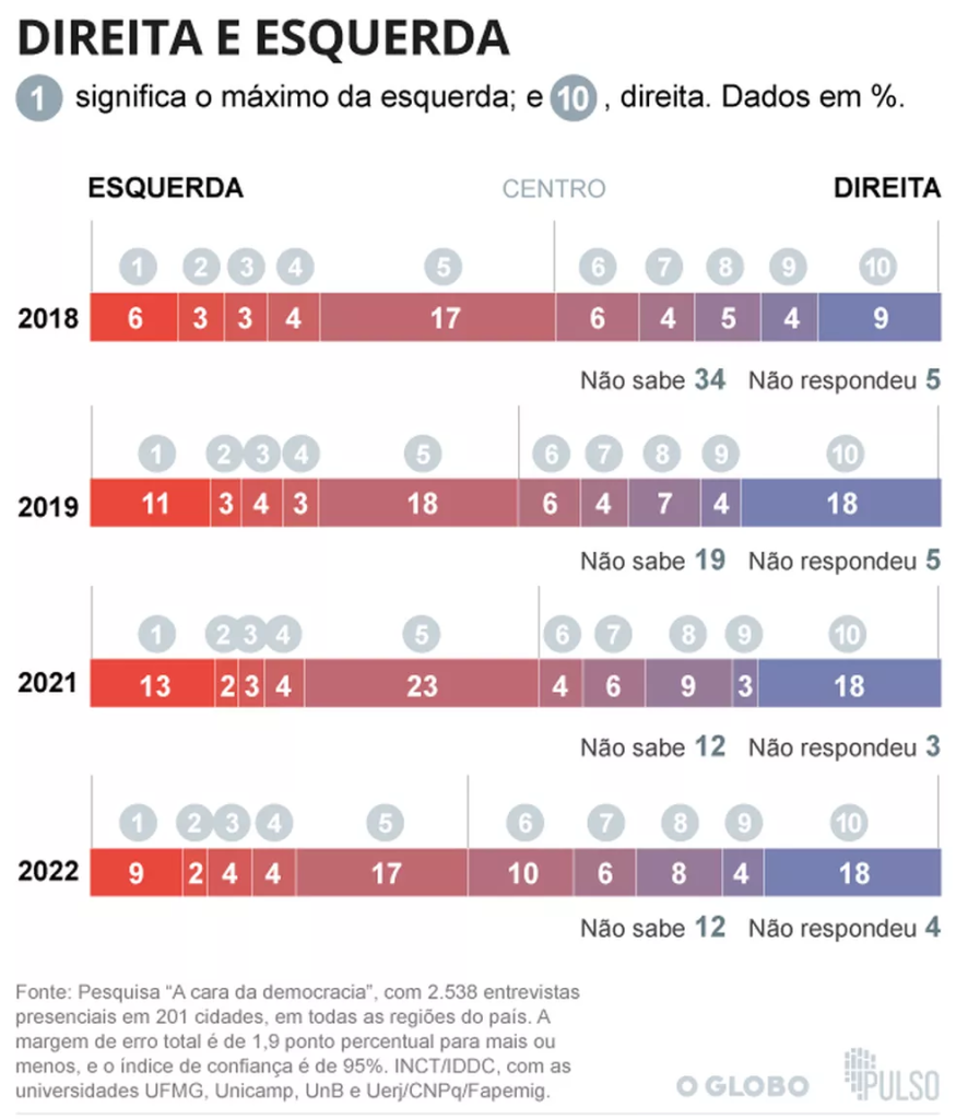 Como a construção do que é ser de direita ou esquerda faz parte do dia a dia político e seus significados, instáveis, sofrem alterações ao longo do tempo, há métodos que buscam medir ideologia a partir do cruzamento de opiniões que dividem a sociedade. Já nesta pesquisa, que usa somente a autodeclaração, é possível verificar respostas confirmando uma direita convicta sedimentada, mas também outros resultados que mostram avanços claros em pautas pró-democracia.