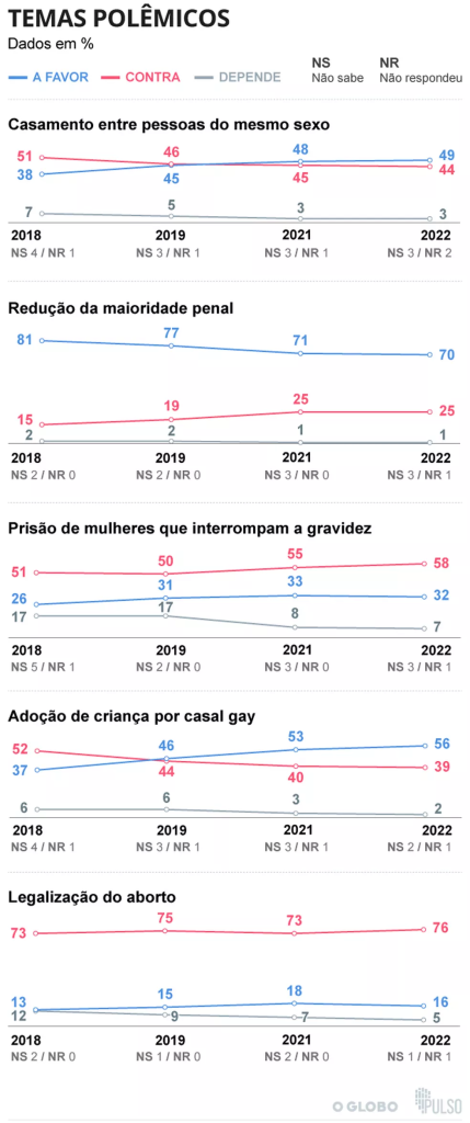 Na redução da maioridade penal (no geral, 70% a favor e 25% contra), tanto homens (74%) quanto mulheres (67%) têm percentuais semelhantes em prol de punições para infratores menores de idade. A situação é semelhante no recorte por renda, com 68% a favor (até dois salários mínimos), 72% (dois a cinco) e 74% (mais de cinco), o que configura um tema de amplo apoio popular. O mesmo ocorre sobre a legalização do aborto, com recortes de sexo e renda rejeitando a medida sem variações.