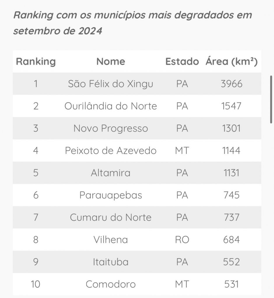 Entre os dez municípios que mais degradaram florestas na Amazônia, sete estão no Pará. Os maiores destaques negativos incluem São Félix do Xingu, que, sozinho, foi responsável por 3.966 km² de áreas degradadas, Ourilândia do Norte (1.547 km²) e Novo Progresso (1.301 km²).
