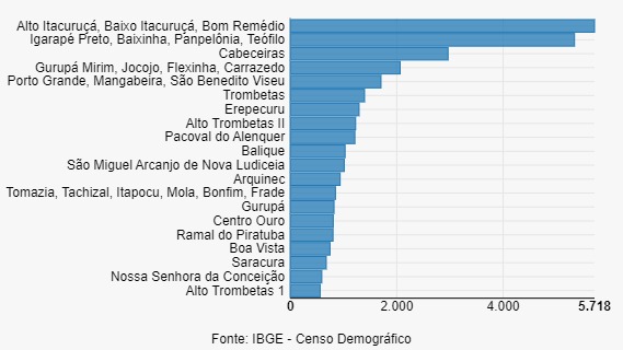 Em 4º lugar, o TQ que aglutina as comunidades Igarapé Preto, Baixinha, Panpelônia, Teófilo (município de Baião) aparece em 4º lugar do Brasil em população absoluta, com 4.073 pessoas quilombolas (2,4% dos quilombolas do Brasil em TQ’s); em 7º lugar, têm o TQ Cabeceiras (em Óbidos), com 2.929 quilombolas (1,5% do total no Brasil em TQ).
