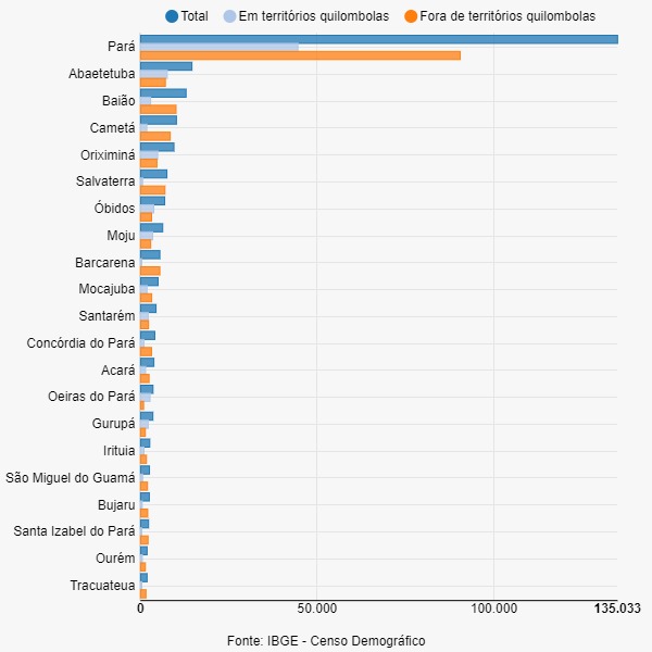 Na lista dos 10 Territórios Quilombolas (TQ’s) com maior quantidade absoluta de pessoas quilombolas, o Pará é destaque: o TQ que envolve as comunidades de Alto Itacuruçá, Baixo Itacuruçá e Bom Remédio (em Abaetetuba) aparece como 2º do Brasil em população absoluta, com 5.638 residentes quilombolas, o que representa 3,4% do total de quilombolas do Brasil residentes em TQ’s.