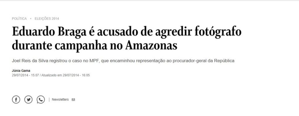 Já em setembro de 2014, o Ministério Público Federal, no Amazonas (MPF/AM), encaminhou ao então procurador-geral da República, Rodrigo Janot, uma representação contra o senador Eduardo Braga (PMDB-AM). À época, o político do Amazonas era candidato ao Governo do Amazonas. Junto com o ex-deputado federal Sabino Castelo Branco (PTB-AM), Braga foi acusado de agredir um fotógrafo amador, considerado vulnerável e portador de deficiência intelectual, durante carreata de campanha, no município de Maraã, na região do Alto Solimões, interior do Amazonas.