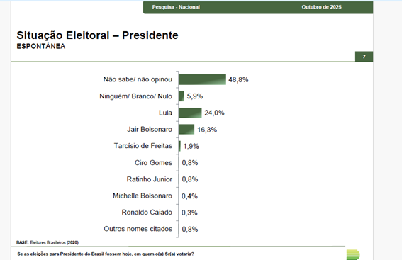 Na pesquisa espontânea, quando não são apresentados nomes de candidatos, Lula registra 24,0% das intenções de voto. O ex-presidente Jair Bolsonaro aparece em segundo lugar, com 16,3%. Uma fatia significativa, de 48,8%, dos eleitores declara não saber ou não ter opinado.