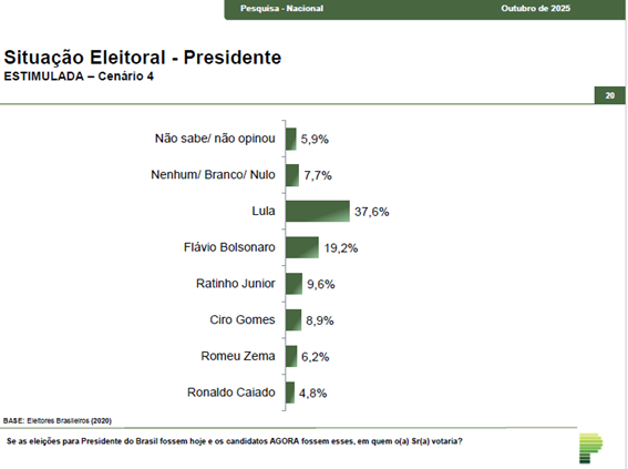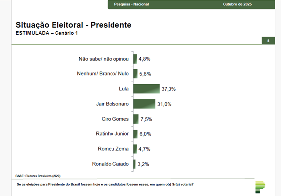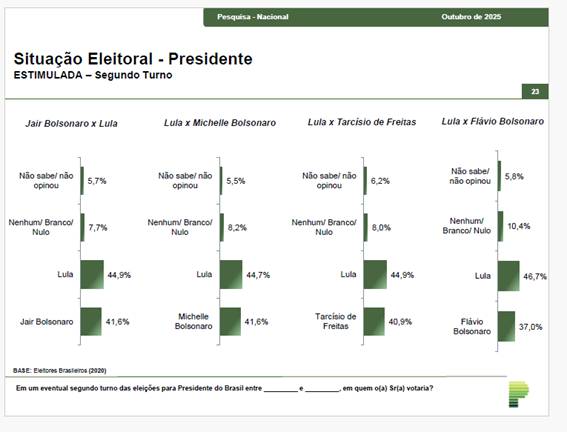 BRASÍLIA (DF) – O Instituto Paraná Pesquisas divulgou, nesta terça-feira, 27, o resultado de sua Pesquisa de Opinião Pública Nacional sobre a Situação Eleitoral para o Executivo Federal, realizada entre os dias 21 e 24 de outubro. Os dados indicam que o atual presidente, Luiz Inácio Lula da Silva (PT), lidera em todos os cenários estimulados de primeiro turno e aparece à frente em todas as simulações de segundo turno contra potenciais adversários.