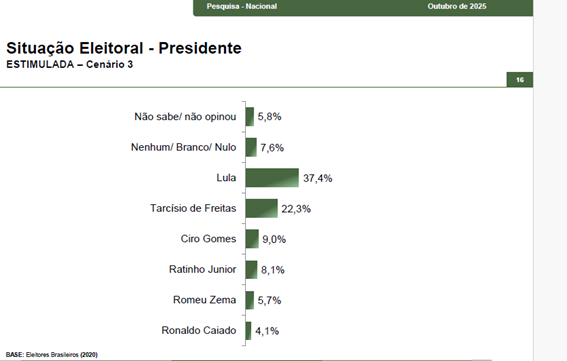 Já no Cenário 3, que coloca Tarcísio de Freitas (22,3%) na disputa, Lula registra 37,4%. A maior pontuação do presidente no primeiro turno ocorre no Cenário 4, contra Flávio Bolsonaro (19,2%), alcançando 37,6%. Outros nomes, como Ciro Gomes (variando entre 7,5% e 9,0%), Ratinho Junior (entre 6,0% e 9,6%), Romeu Zema (entre 2,0% e 6,2%) e Ronaldo Caiado (entre 3,2% e 4,8%), pontuam de acordo com a composição dos cenários.