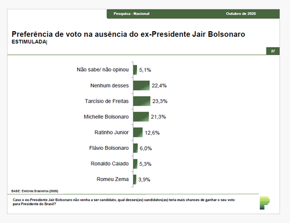 O levantamento também simulou a preferência de voto na ausência do ex-presidente Jair Bolsonaro. Nesse cenário estimulado, Tarcísio de Freitas lidera, com 23,3% das intenções de voto. Michelle Bolsonaro aparece em seguida, com 21,3%. A soma dos que votariam em “nenhum desses” atinge 22,4%.