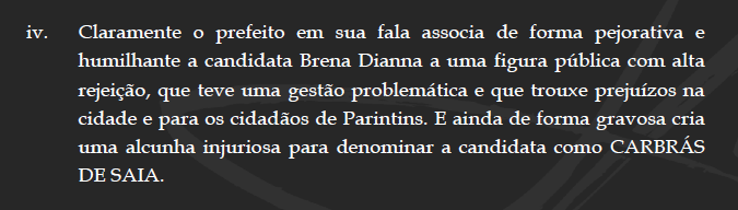A Coligação Majoritária União por Parintins (União Brasil, PP, PRD, DC, Agir, Mobiliza, PSB) acusa o prefeito de “reduzi-la a uma versão feminina de um político mal-visto, atingindo-a em sua condição de mulher”, conforme documento da denúncia.