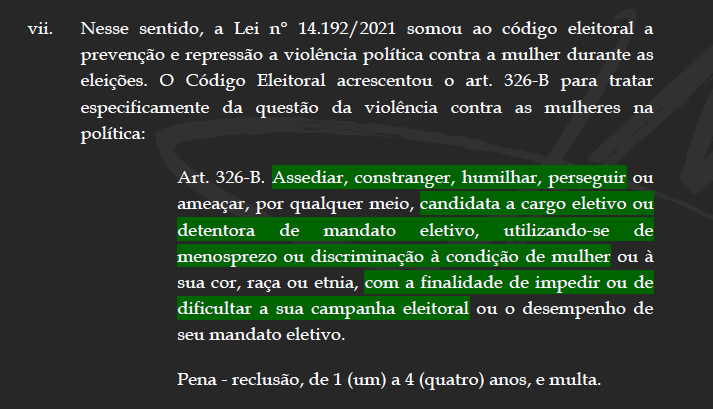 A Coligação acusa Bi Garcia de violar a Lei n° 14.192/2021, que somou ao código eleitoral a prevenção e repressão a violência política contra a mulher durante as eleições. O Artigo 326-B. indica que: “Assediar, constranger, humilhar, perseguir ou ameaçar, por qualquer meio, candidata a cargo eletivo ou detentora de mandato eletivo, utilizando-se de menosprezo ou discriminação à condição de mulher ou à sua cor, raça ou etnia, com a finalidade de impedir ou de dificultar a sua campanha eleitoral ou o desempenho de seu mandato eletivo”. A acusação é cabível de punição, com a pena de reclusão de um a quatro anos e multa.