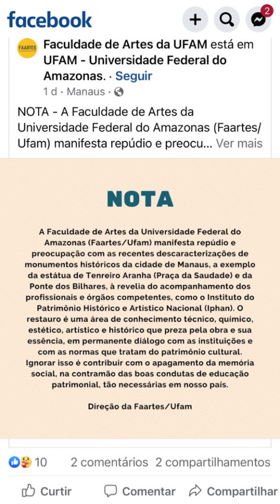 Por meio de nota, divulgada nas redes sociais, a Faculdade de Artes da Universidade Federal do Amazonas (Faartes/Ufam) defendeu que o restauro é uma área de conhecimento técnico, químico, estético, artístico e histórico que preza pela obra e sua essência, em permanente diálogo com as instituições e com as normas que tratam do patrimônio cultural.
