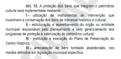 Centro Histórico; arrecadação de bem tombado abandonado, nos moldes definidos em legislação municipal específica.