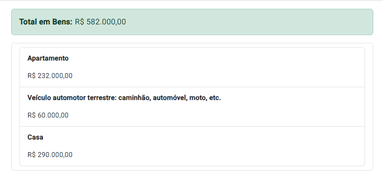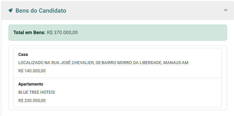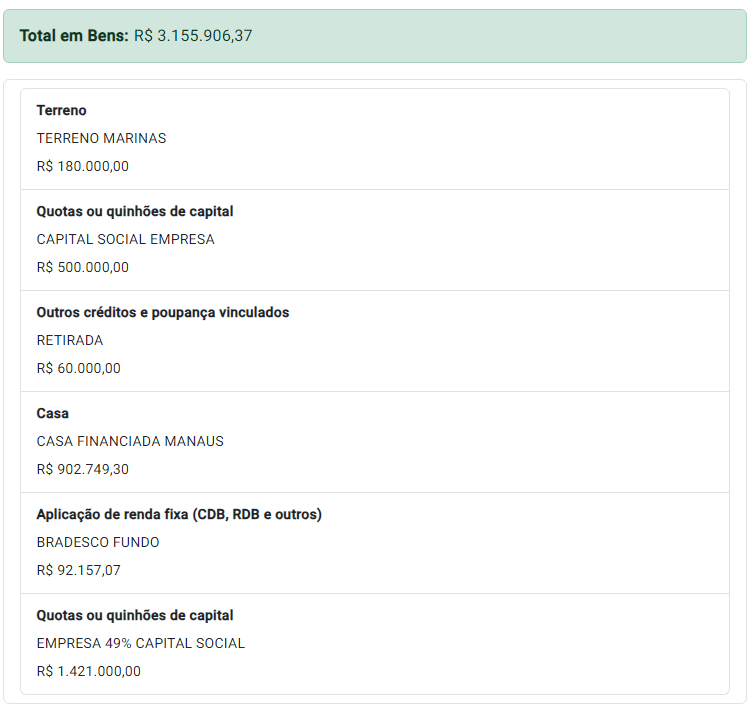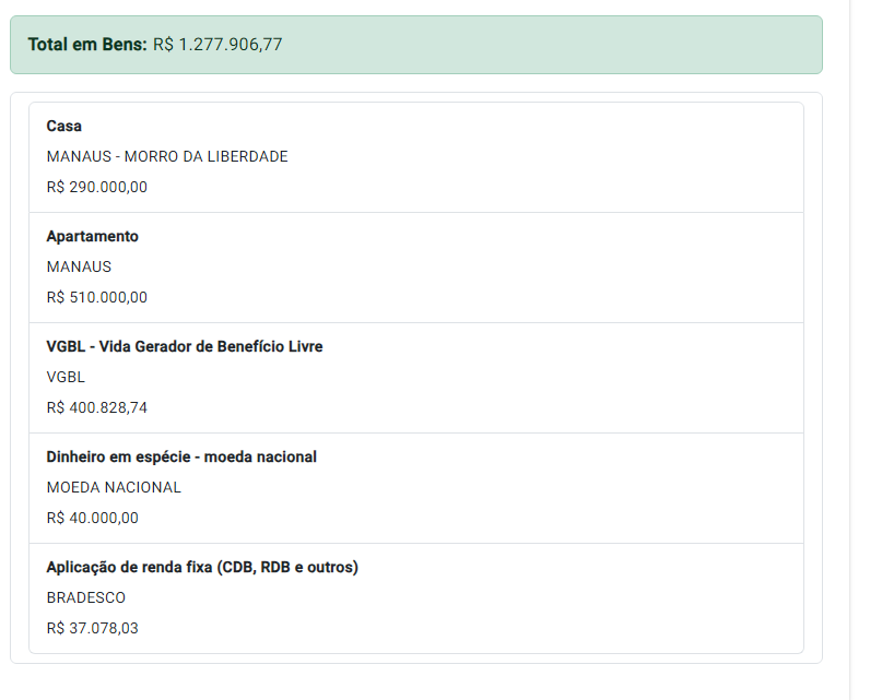 Entre 2020 e este ano, o aumento monetário dos bens equivale a R$ 420.377,77, ou seja, 49%. Na lista de patrimônios deste pleito há cinco bens, sendo uma casa no bairro Morro da Liberdade, Zona Centro-Sul, no valor de R$ 290 mil e um apartamento, sem endereço especificado, avaliado em R$ 510 mil. Os outros bens correspondem a um plano de previdência de R$ 400.828,74, R$ 40 mil em dinheiro em espécie e aplicação de renda fixa de R$ 37.078,03.