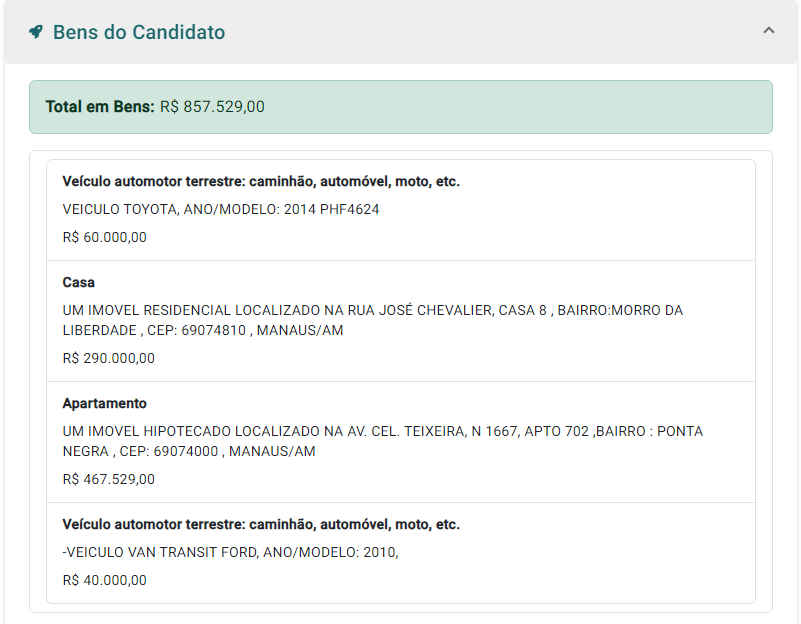 No pleito de 2020, David Almeida declarou quatro bens que somaram, a época, R$ 857.529,00. Na lista estavam dois imóveis, sendo a casa no bairro Morro da Liberdade, também avaliada em R$ 290 mil, e um apartamento no bairro Ponta Negra, Zona Oeste da cidade, de R$ 467.529,00.