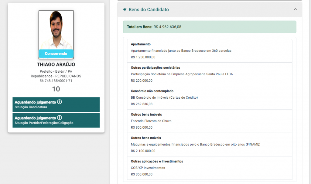 O candidato mais rico, conforme as declarações, é o deputado estadual Thiago Araújo, do Republicanos, que possui um patrimônio declarado de R$ 4.962.636,08. Seus bens incluem uma fazenda avaliada em R$ 800 mil, máquinas e equipamentos financiados no valor de R$ 2,1 milhão, e um apartamento financiado em R$ 1,2 milhão.
