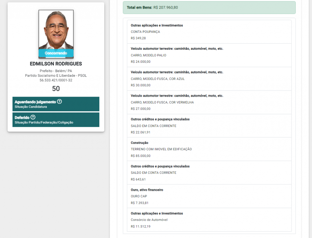 Por outro lado, o atual prefeito e candidato à reeleição, Edmilson Rodrigues, do Psol, possui o menor patrimônio declarado: R$ 207 mil em bens, sendo o de maior valor um terreno com imóvel em construção, avaliado em R$ 85 mil.