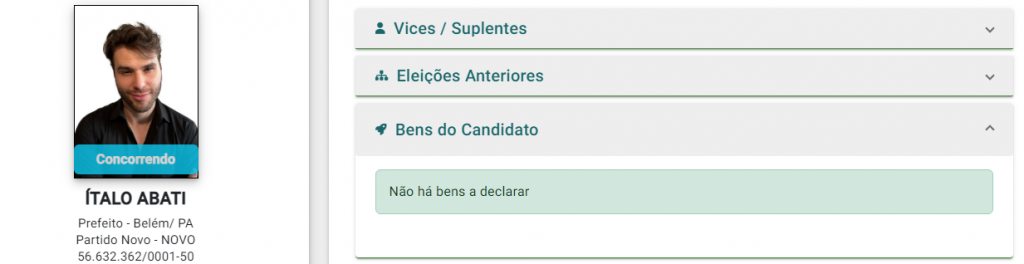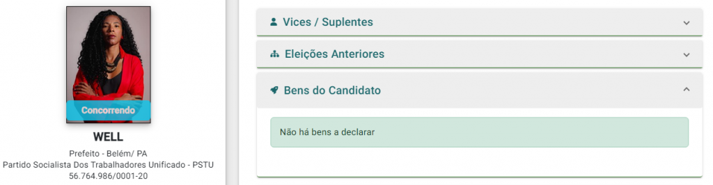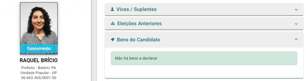 Entre os nove candidatos, três informaram não possuir qualquer bem: Wellingta Macedo (PSTU), Raquel Brício (UP) e Italo Abati (Novo).