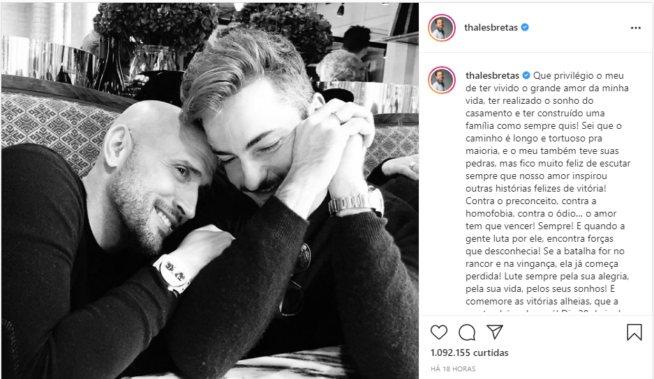 “Que privilégio o meu de ter vivido o grande amor da minha vida, ter realizado o sonho do casamento e ter construído uma família como sempre quis! Sei que o caminho é longo e tortuoso para a maioria, e o meu também teve suas pedras, mas fico muito feliz de escutar sempre que nosso amor inspirou outras histórias felizes de vitória!”, escreveu ele no Instagram.