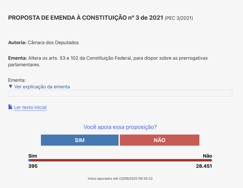 BRASÍLIA (DF) – Quase 99% das pessoas que votaram, até a manhã desta segunda-feira, 22, na enquete aberta pelo Senado sobre a Proposta de Emenda à Constituição (PEC 3/2021), conhecida como “PEC da Blindagem”, desaprovam a medida que altera as regras do foro privilegiado dos parlamentares. A matéria será analisada já na reunião da Comissão de Constituição e Justiça da Casa (CCJ), agendada para quarta-feira, 24. O relator designado, senador Alessandro Vieira (MDB-SE), declarou que seu relatório será pela rejeição ao texto aprovado pela Câmara dos Deputados, na semana passada.