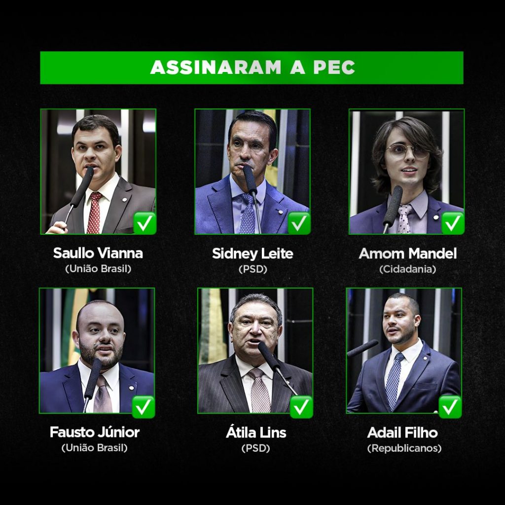 Até o momento, os parlamentares da bancada amazonense Adail Filho (Republicanos), Amom Mandel (Cidadania), Átila Lins (PSD), Fausto Júnior (União Brasil), Saullo Vianna (União Brasil) e Sidney Leite (PSD) assinaram a proposta. Os deputados Capitão Alberto Neto (PL) e Silas Câmara (Republicanos) não apoiaram o texto.