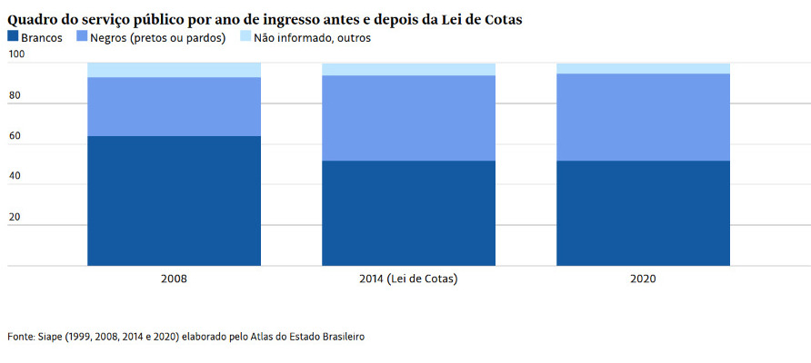 Em dados absolutos, dos 1.581 servidores que entraram em 2000, apenas 266 eram negros. Esse número ganhou mais equilíbrio em 2014, ano da Lei de Cotas, quando dos 36.365 contratados no funcionalismo federal, 15.204 eram pretos ou pardos.