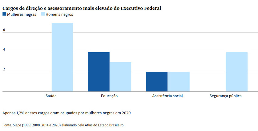 Atualmente, em quatro áreas estratégicas do governo federal (saúde, educação, segurança pública e assistência social), há 19% de negros em cargos de chefia, segundo o levantamento da República.