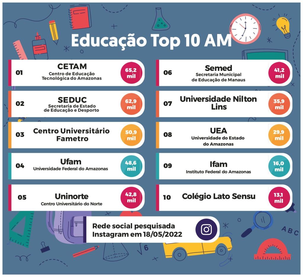 Já dentre os órgãos educacionais, o Cetam também aparece na frente, seguido pela Seduc, Centro Universitário Fametro (50,9 mil) e a Universidade Federal do Amazonas (48,6 mil). Completam o ranking: Uninorte, Secretaria Municipal de Educação de Manaus, Universidade Nilton Lins, Universidade do Estado do Amazonas, Instituto Federal do Amazonas e Colégio Lato Sensu.