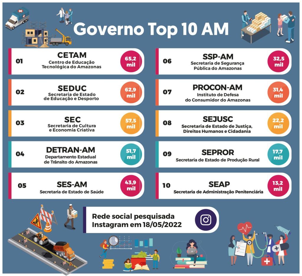 Deixando de fora o perfil oficial do Governo do Amazonas, que atualmente conta com mais de 220 mil seguidores, o Centro de Educação Tecnológica do Amazonas (Cetam) é o mais seguido, dentre 14 secretarias e 12 autarquias, com 65,4 mil seguidores. Em seguida, se encontram a Secretaria de Estado de Educação e Desporto (Seduc), com 62,9 mil e a Secretaria de Cultura e Economia Criativa (SEC), com 57,5 mil seguidores.