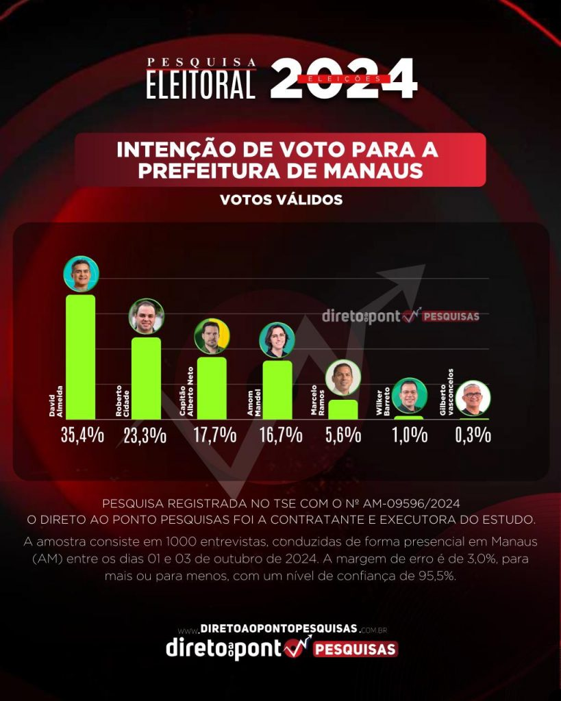 A consolidação da ida de Cidade ao segundo turno também foi apontada nessa sexta-feira, 4, quando o instituto Direto ao Ponto divulgou o 8º levantamento sobre a corrida eleitoral em Manaus, apontando um cenário de segundo turno entre David Almeida e Roberto Cidade. Com o prefeito e o deputado estadual na liderança, Alberto Neto (PL) apareceu em terceiro lugar, seguido por Amom Mandel (Cidadania).