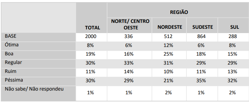 - 1% classificaram como “ótimo” e 55% como “péssimo”.